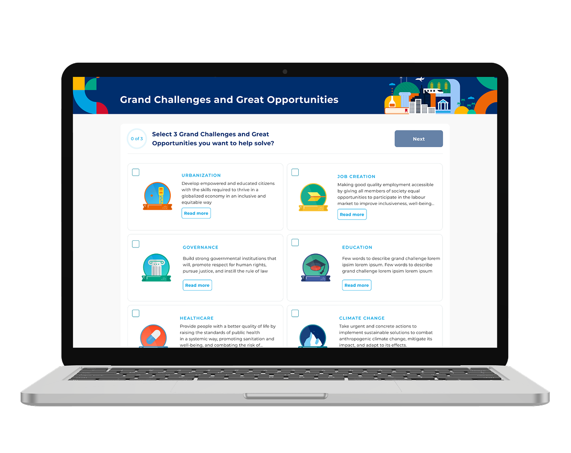 The learning plan implies that students define their personal Missions, like solving human and wildlife conflicts in the community. They can also select 2-3 Global Challenges and Great Opportunities they want to address such as Urbanization, Healthcare, Agriculture, Governance, and more.
