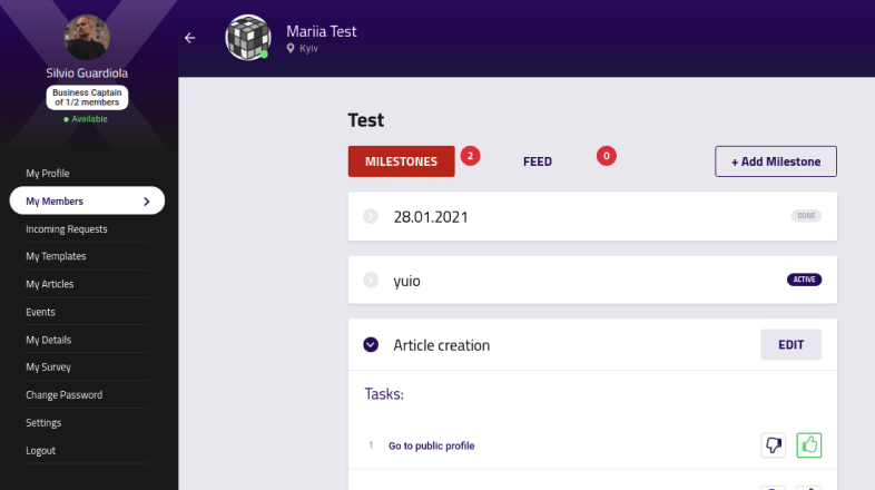 Communication between mentors and members goes through the online chat that includes an automated chatbot with all required system notifications. Every edit displays in the feed of the project.